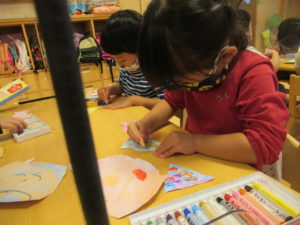 はさみ、クレヨン、のり、マーブリングなどと工程は多かったですが、楽しみながら製作が出来ました!