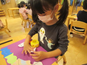 ハロウィン製作では、マーブリングや曲線切りに挑戦しました。