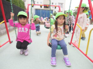先生がブランコを取り付けると「ブランコだ!」とっても嬉しそうなゆり組さん。