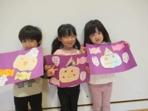 次は折り紙でおばけを折り、あめに模様を描いて最後にのりで貼って完成しました。