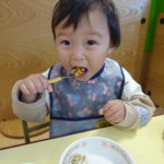 そして沢山遊んだ後にはご飯をもりもり食べています。スプーンで食べるのも上手になり、