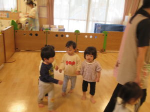 部屋では『さんぽ』の曲に合わせて、お友達と手を繋いで歩く遊びを楽しんできました。