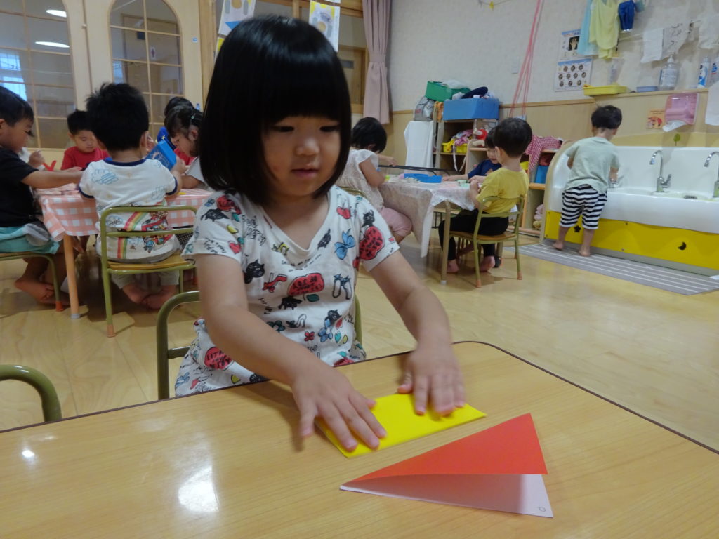 ☆おりがみを三角に折って、おばけのお家をつくるぞ!