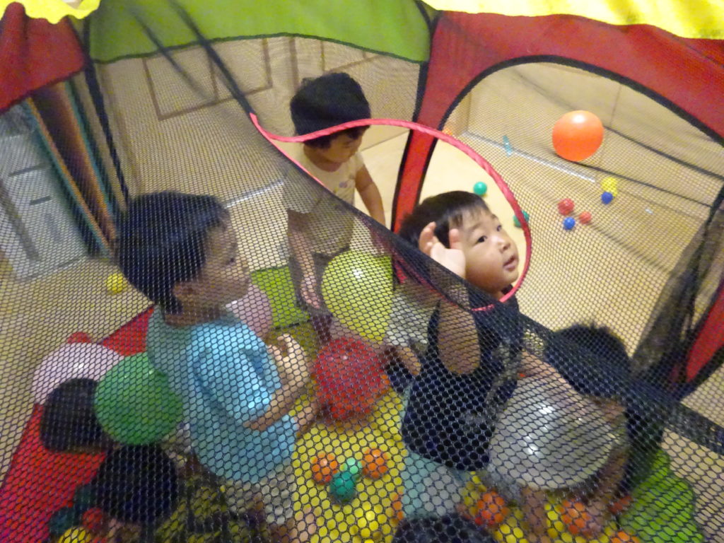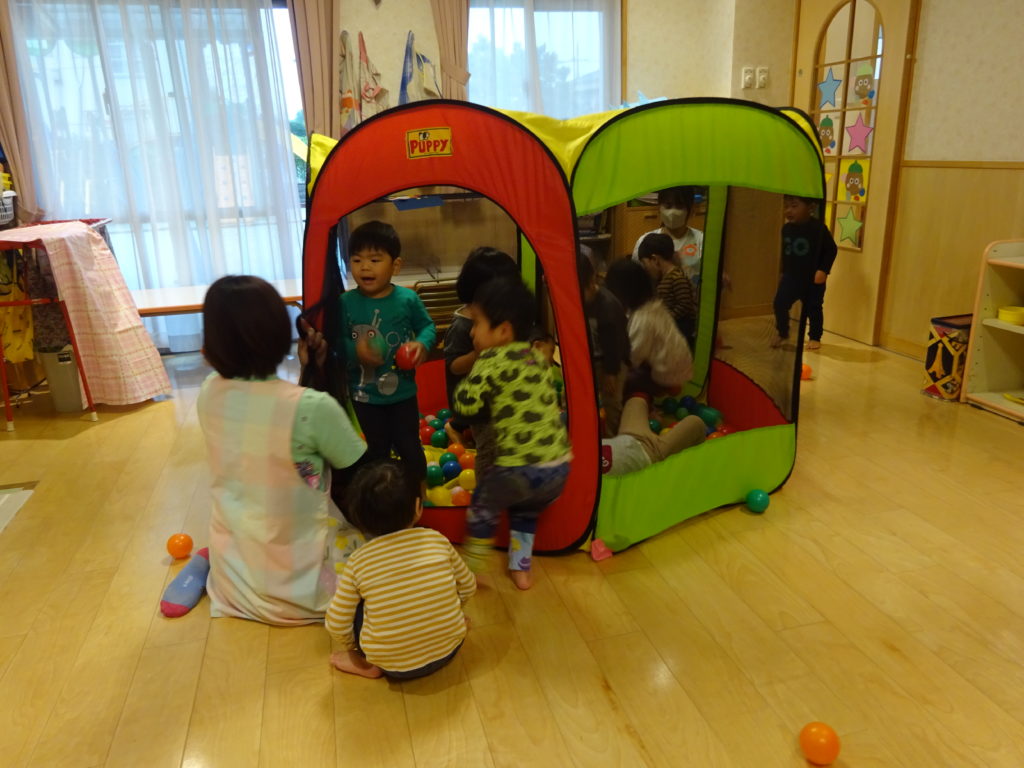 お部屋で、ボールハウスを出して遊ぶとテンション高めな子どもたち。