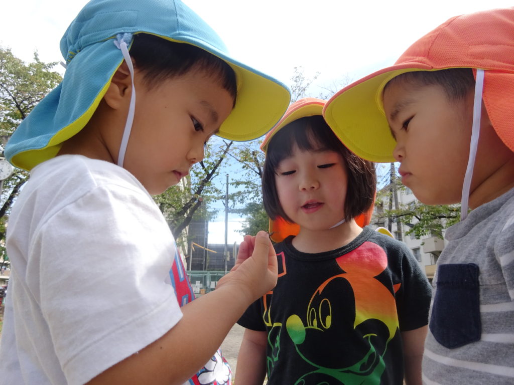 と葉っぱのシャワーをしたり、葉っぱに目をつけてお化けのお面にして、秋の気配を楽しんでいる子どもたちです♪