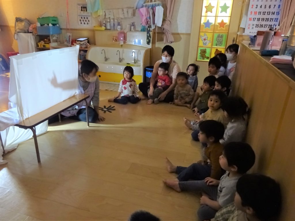 部屋を暗くして、白い布の後ろからライトを照らして影を映し出し、シルエットクイズをして遊びました。