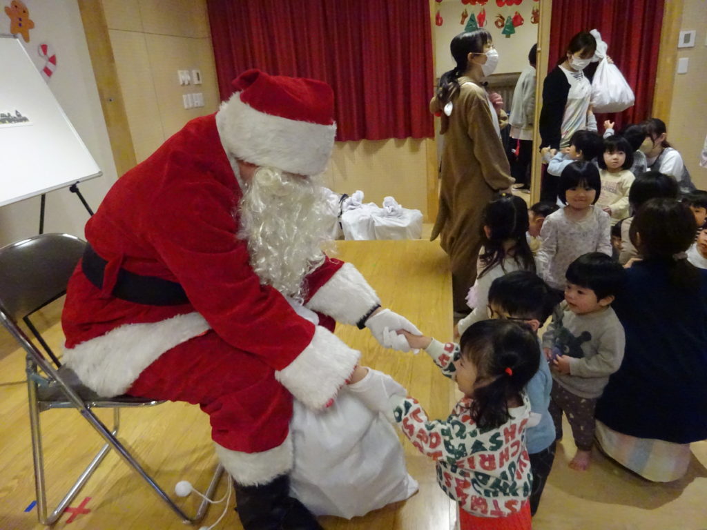 3、4、5歳児クラスは一人ひとりサンタさんから手渡しでプレゼントを貰いました。