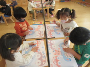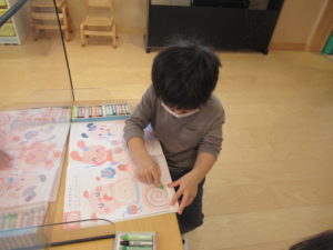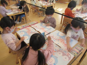 クレヨンの持ち方を覚えて、様々な線の練習をしたり、問題を理解してシール貼りや色塗りをしています。集中して取り組む時間も長くなり、最後までやり遂げることも増えてきて成長を感じられます。
