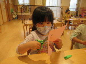 はさみが上手になったゆり組さん。進級当初は一回切りから始め、