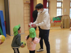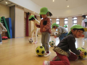 鬼ごっこやキャッチ、ドリブル、シュートの練習をします。