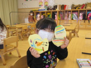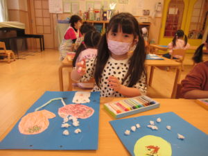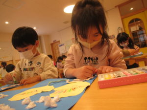 手袋の形に切る時に曲線が難しかったようですが、最後まで一生懸命取り組んでいました。
