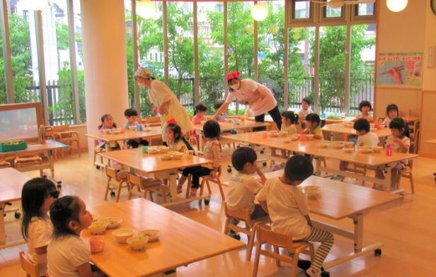 3〜5歳児は、ランチルームで食事をします。4、5歳児は、個々に応じて休憩をとったり、遊んだりします。